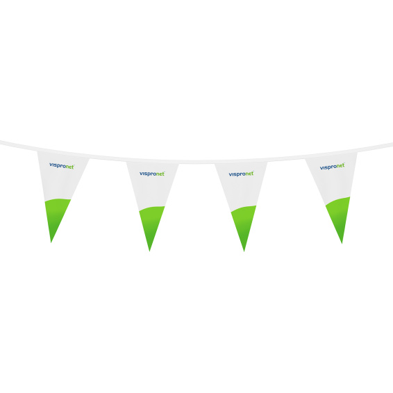 De la promotion à la fête de jardin: les guirlandes en tissu réutilisables sont des décorations polyvalentes et accrocheuses – faciles à fixer et utilisables aussi bien en intérieur qu’en extérieur. Disponibles sur demande avec jusqu’à trois motifs alternés par guirlande, pour une décoration variée.