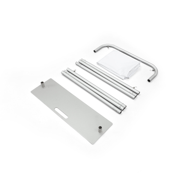 76 x 296 cm; 92 x 296 cm - Cadre en aluminium composé profilés facile à assembler, tube Ø 33 mm, épaisseur du profilé 1,25 mm (les 3 segments des tiges reliés par élastique), boutons d’arrêt à ressort, structure équipée de ressorts crochetés pour fixation de la voile à œillets