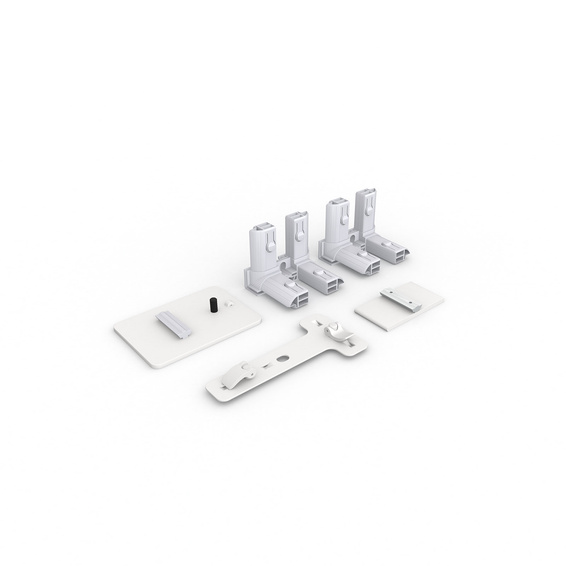 Verbinder aus pulverbeschichtetem Stahl, weiß; Eckverbinder und Fußplatte aus weißem Kunststoff